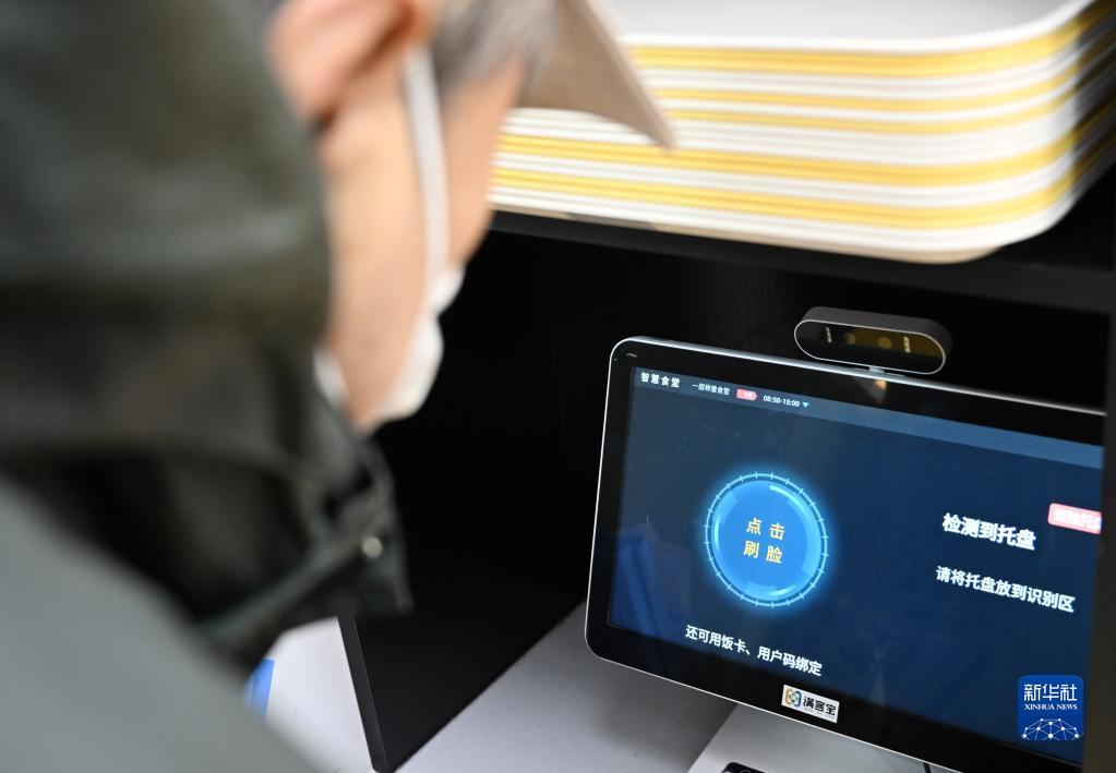 一名老人在天津市和平区南营门街道的老年人“智慧食堂”通过面部识别系统领取餐盘(2月10日摄)。