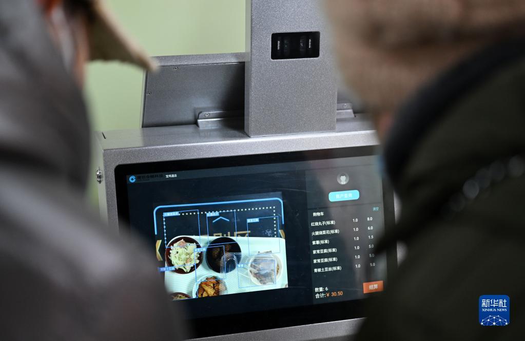 老人在天津市和平区南营门街道的老年人“智慧食堂”通过视觉识别智慧取餐台结算(2月10日摄)。