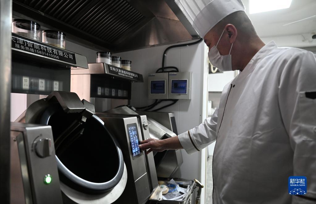厨师在天津市和平区南营门街道的老年人“智慧食堂”后厨操作炒菜机器人(2月10日摄)。