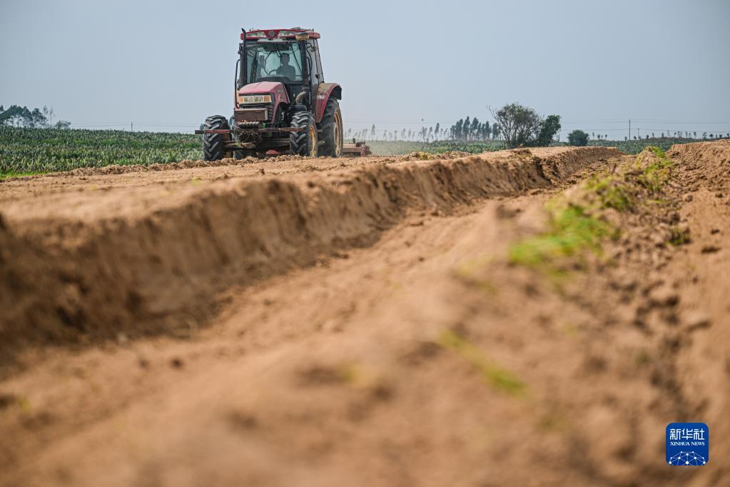 2月20日,在中美墨仙人掌种植基地,工作人员驾驶机械平整土地,为后续种植做准备。