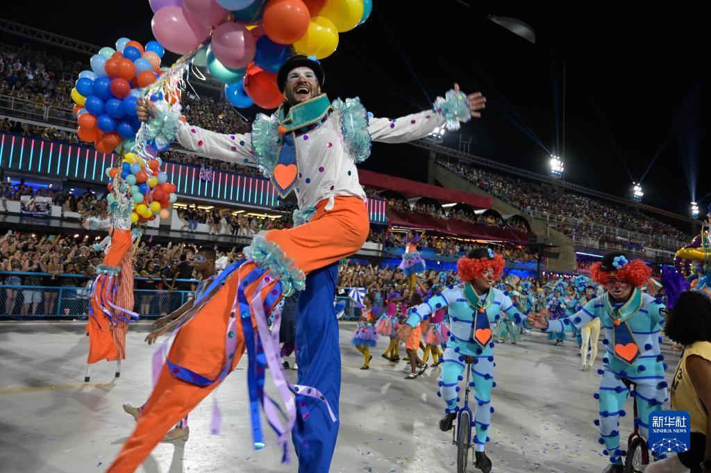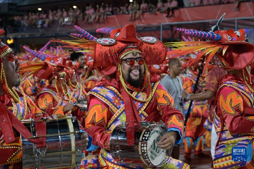 2月21日凌晨,在巴西里约热内卢桑巴大道,一名桑巴舞校演员参加狂欢节游行。