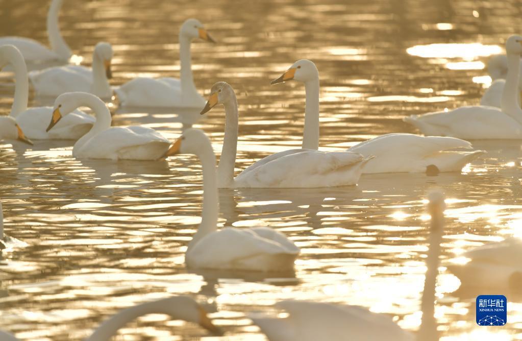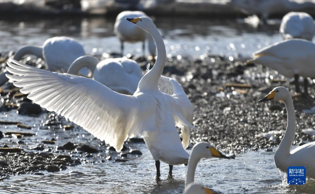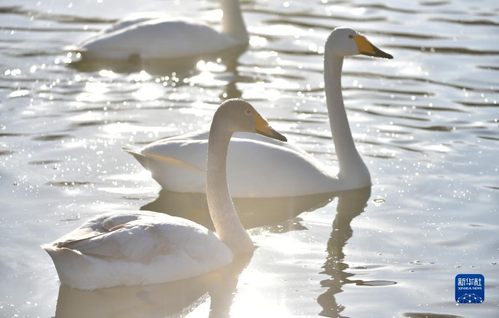 入冬以来,辽宁省北票市八家子乡红村大凌河畔的400多只白天鹅在河水浅滩处嬉戏觅食,吸引人们前来观赏和拍照。
