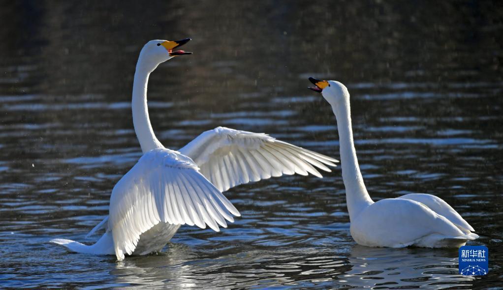 2月21日,天鹅在北票市八家子乡红村大凌河畔嬉戏觅食。