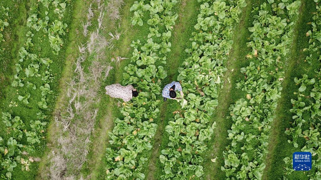 2月24日,在浏阳市小河乡乌石村,农民在一家预制菜企业的蔬菜基地里收割芥菜(无人机照片)。