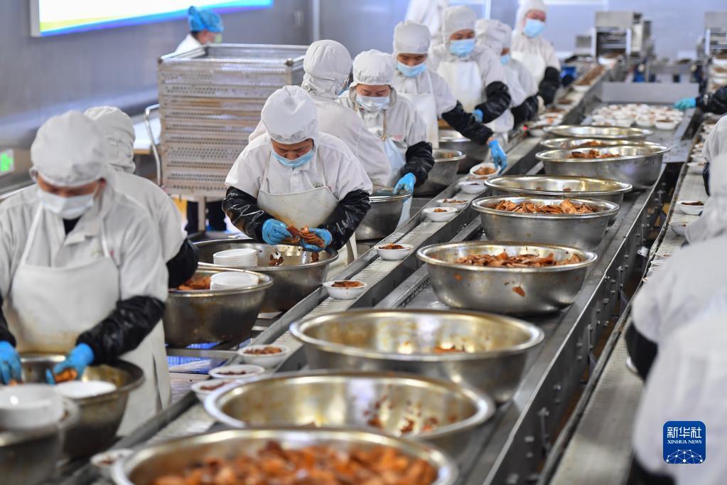 2月24日,浏阳市省级农业科技园区一家预制菜企业工作人员在预制菜生产流水线上作业。