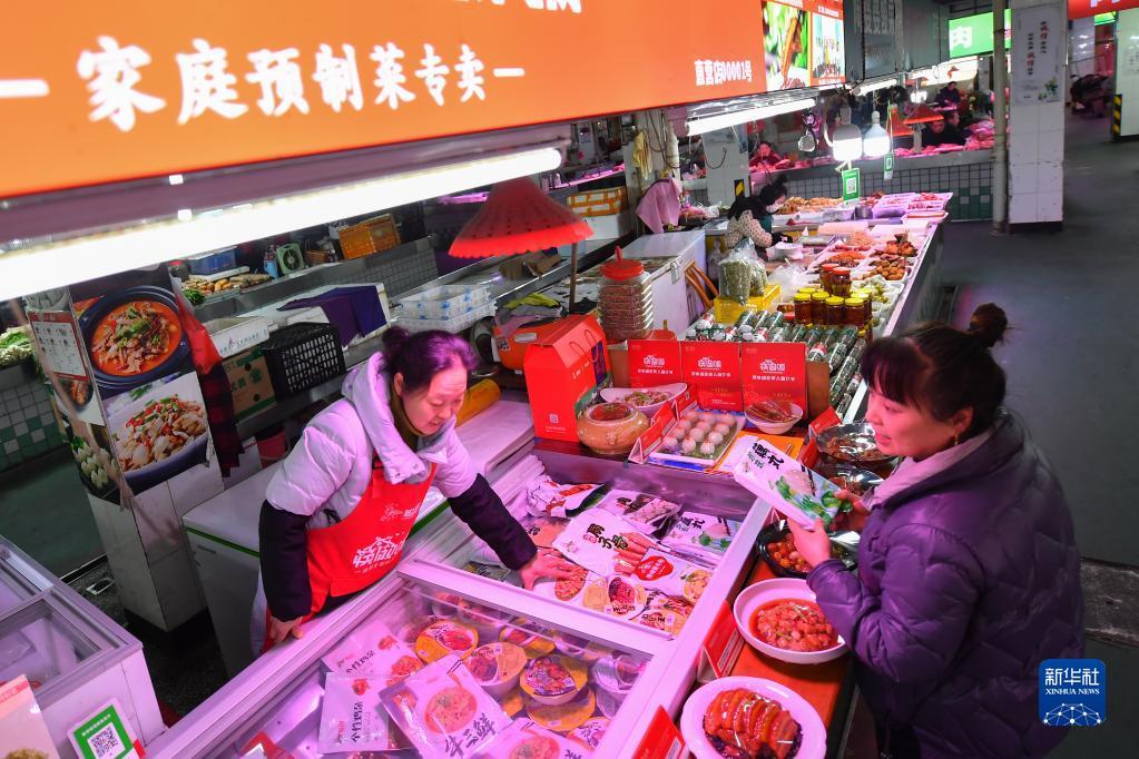 2月24日,消费者(右)在浏阳市圭斋路生鲜市场挑选预制菜。