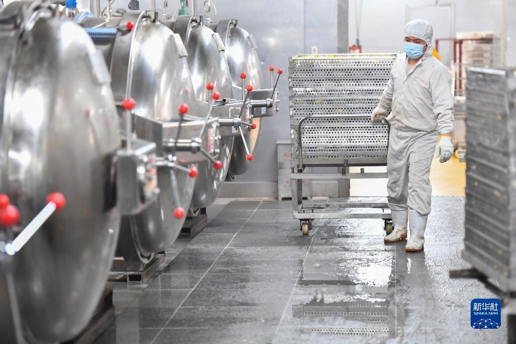 2月24日,在浏阳市省级农业科技园区的一家预制菜企业生产车间,工作人员准备对预制菜进行高温除菌。