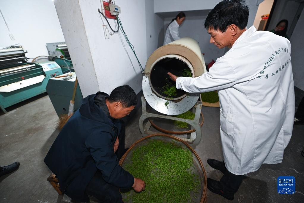 3月22日,赵家镇东庄村上阳自然村“手工茶共富工坊”的致富带头人骆煌喜(右)查看高山有机茶的炒制情况。