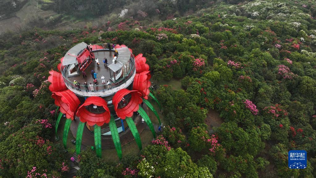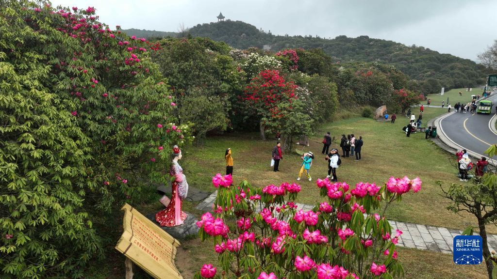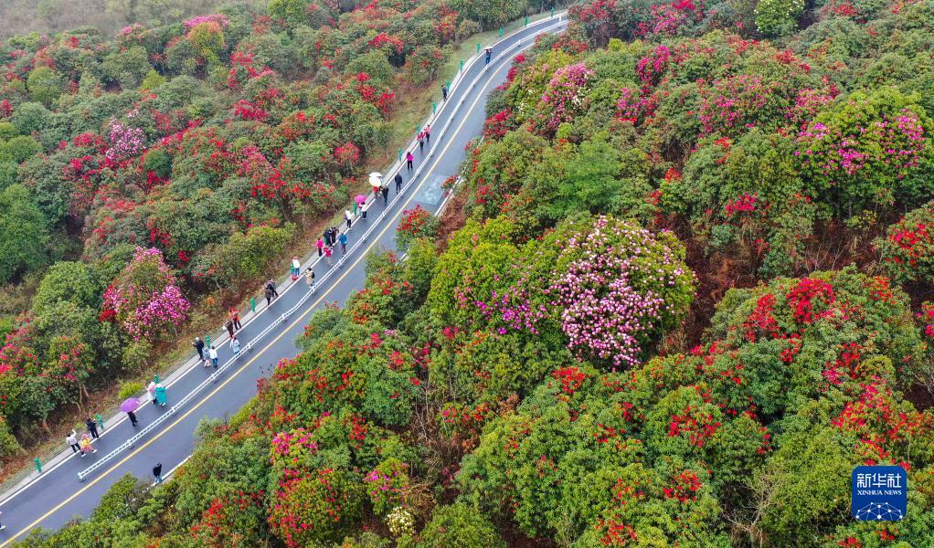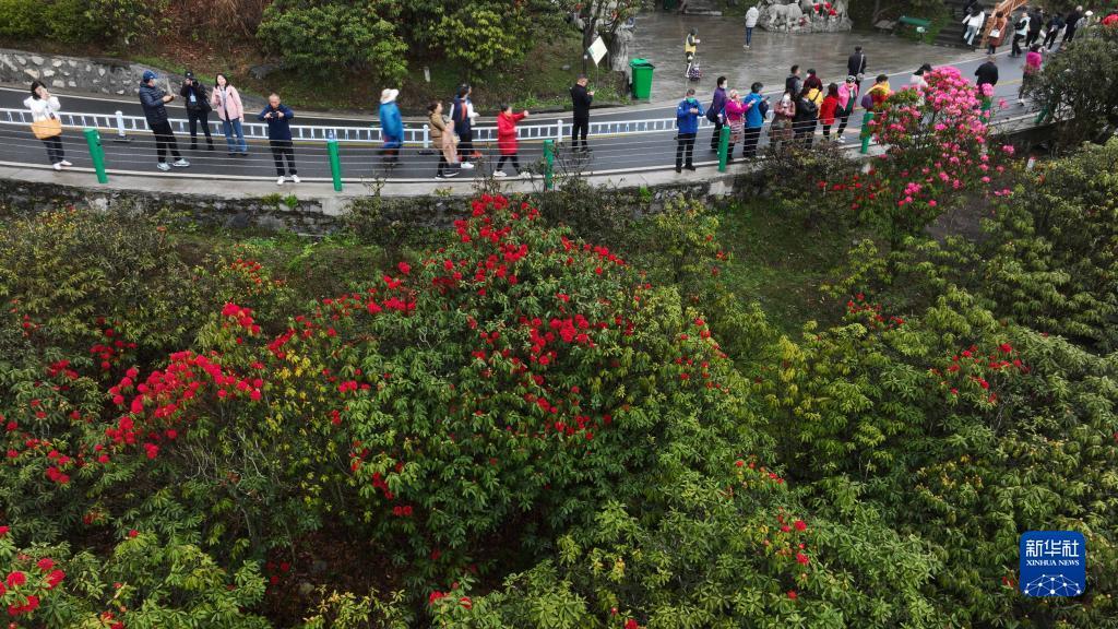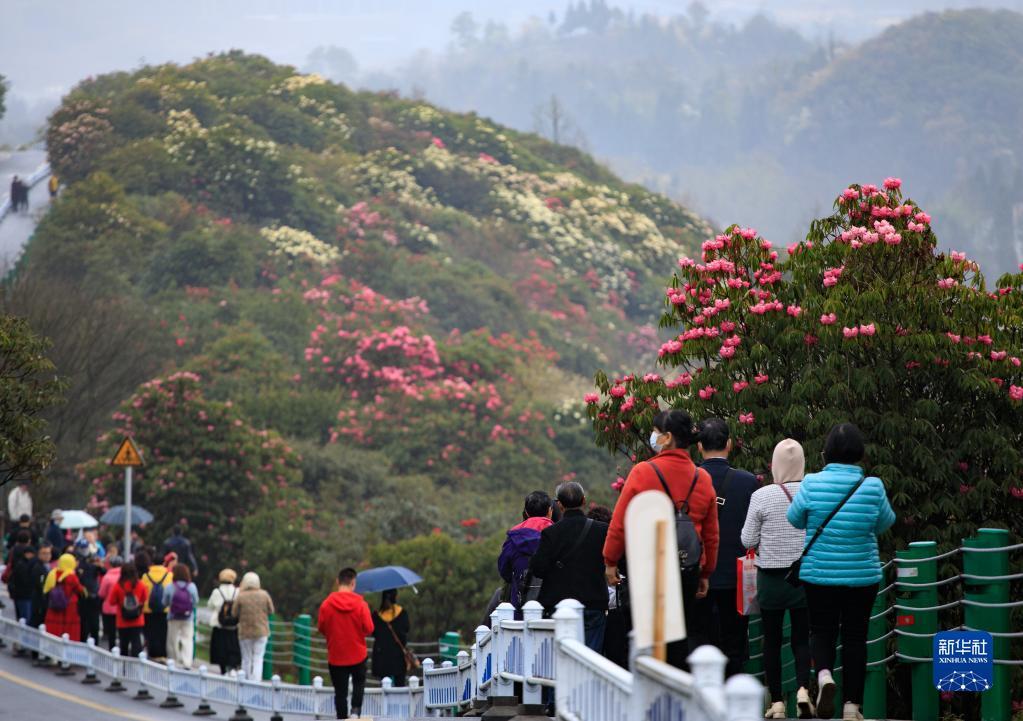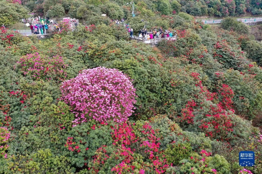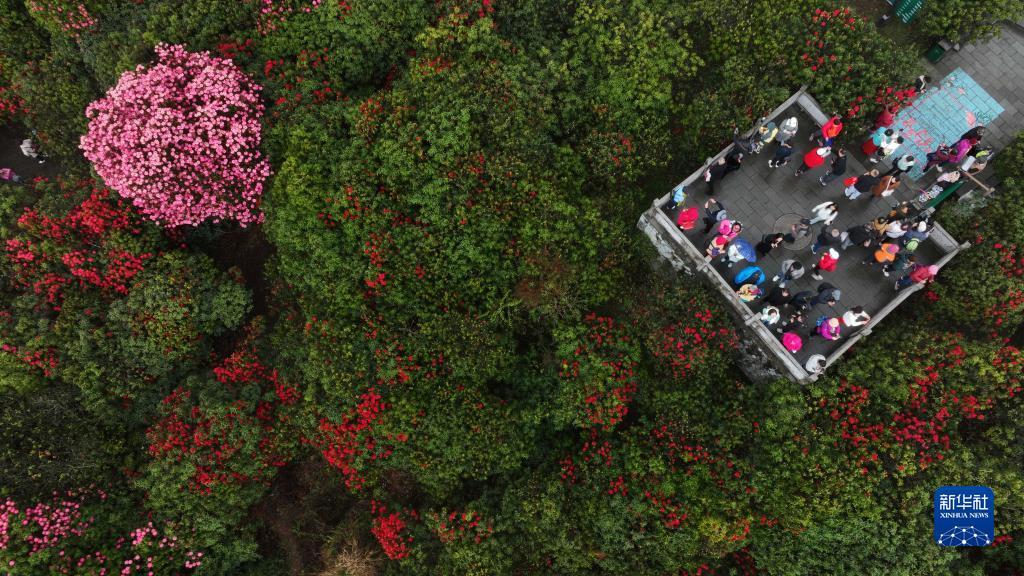 3月27日,游客在贵州省毕节市百里杜鹃管理区天然野生杜鹃林参观游览(无人机照片)。