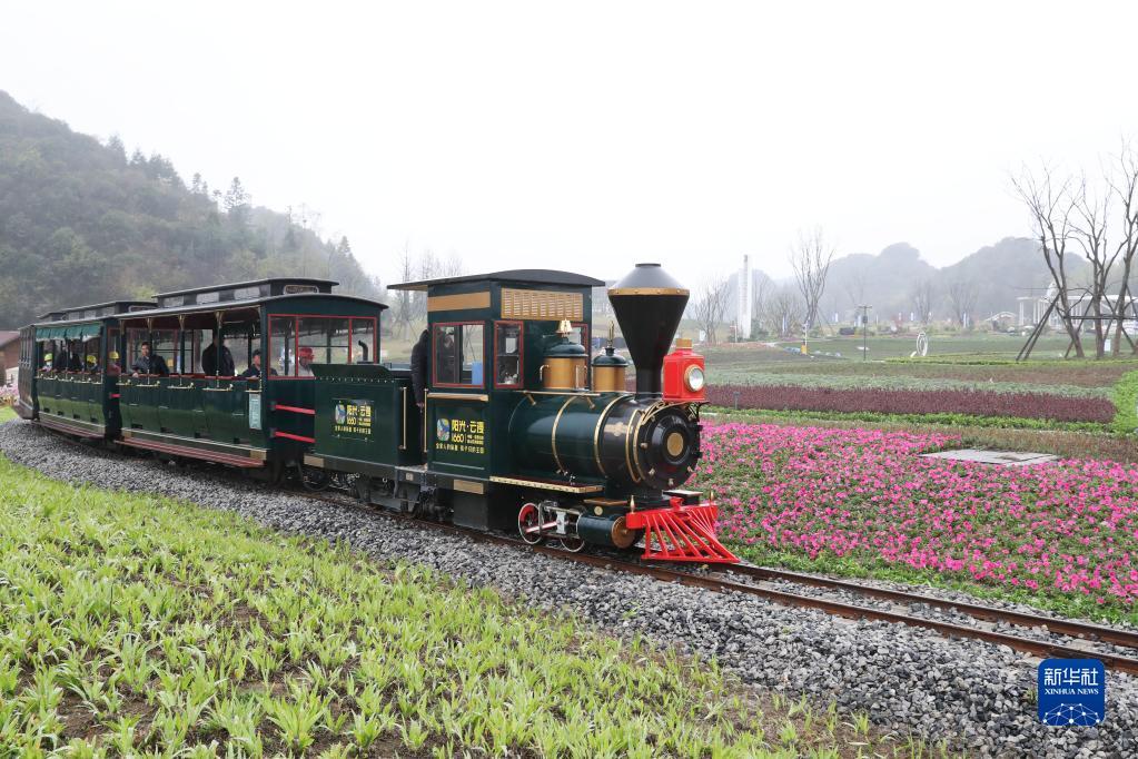3月28日,游客在贵州省毕节市百里杜鹃管理区彝山花谷景区乘坐旅游小火车。