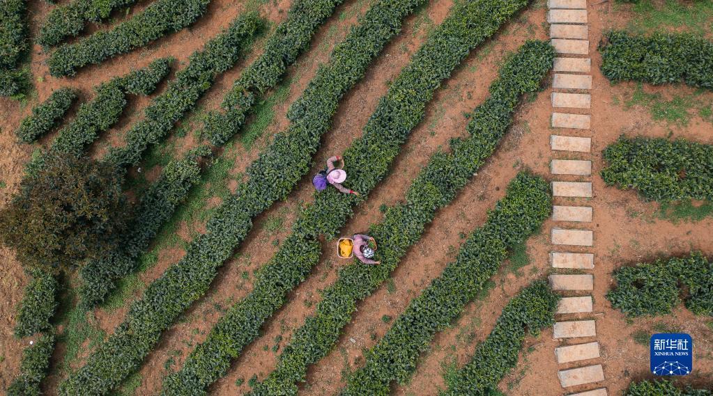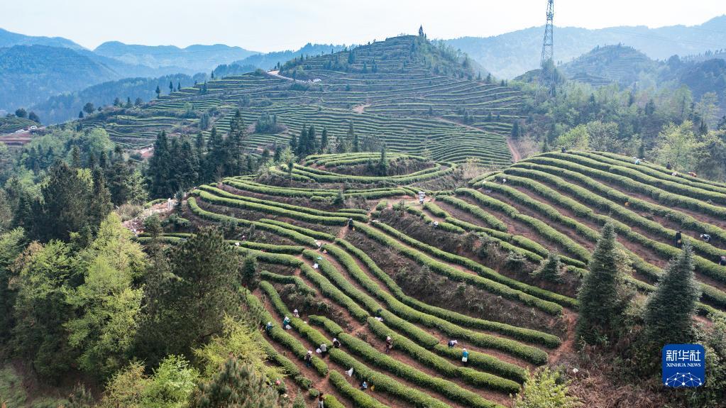 茶农在六盘水市六枝特区月亮河彝族布依族苗族乡花德村茶园采摘春茶(3月31日摄,无人机照片)。