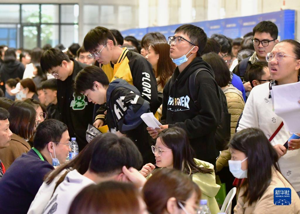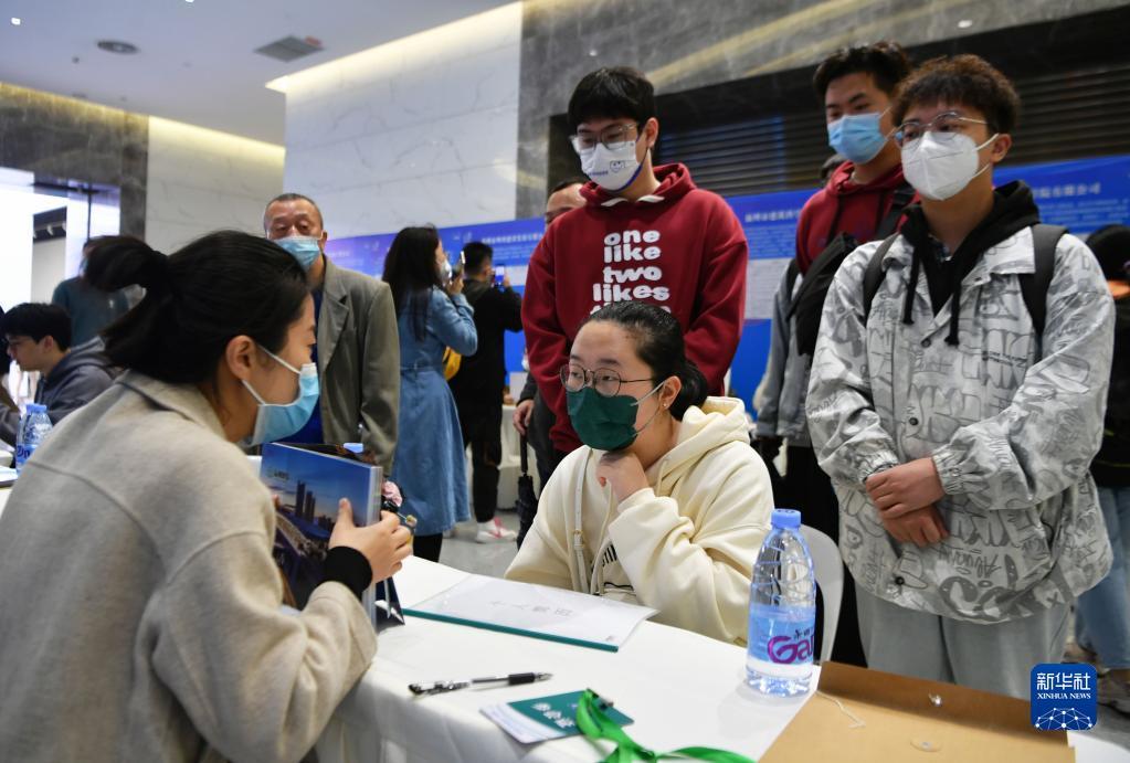 4月7日,高校毕业生在招聘会现场咨询岗位信息。