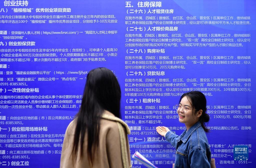 4月7日,高校毕业生在招聘会现场观看高校毕业生来榕留榕就业创业优惠政策。
