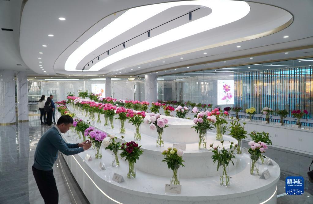 4月9日,人们在昆明国际花卉拍卖交易中心菏泽分中心的花卉样品展示区内参观。