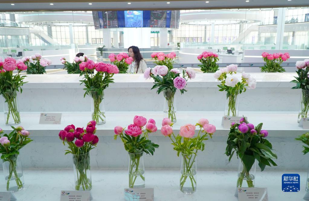 4月9日,人们在昆明国际花卉拍卖交易中心菏泽分中心交易大厅内参观。