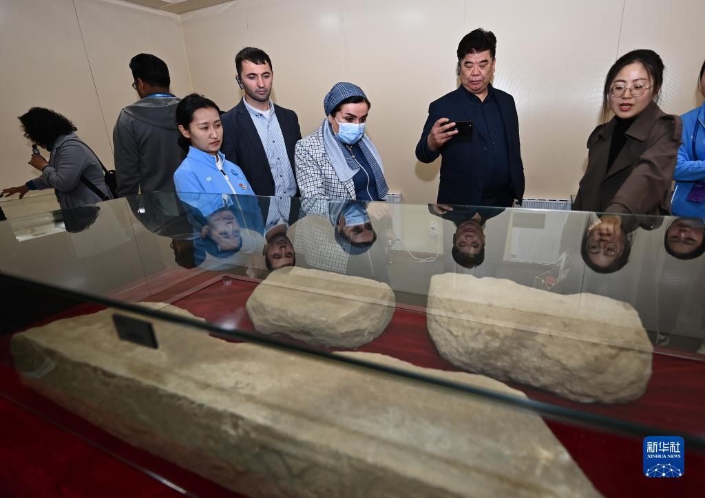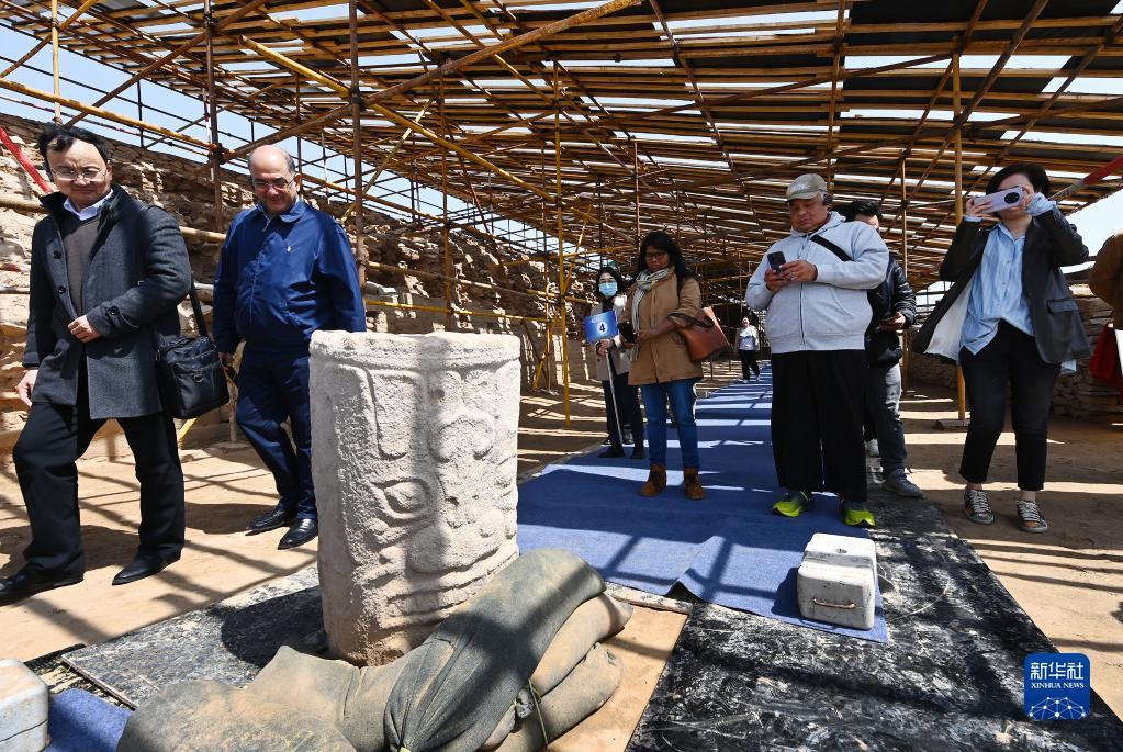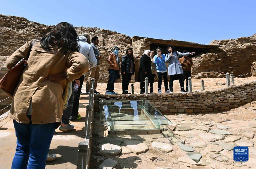 4月26日,外宾在陕西石峁遗址文物医院展厅参观调研。