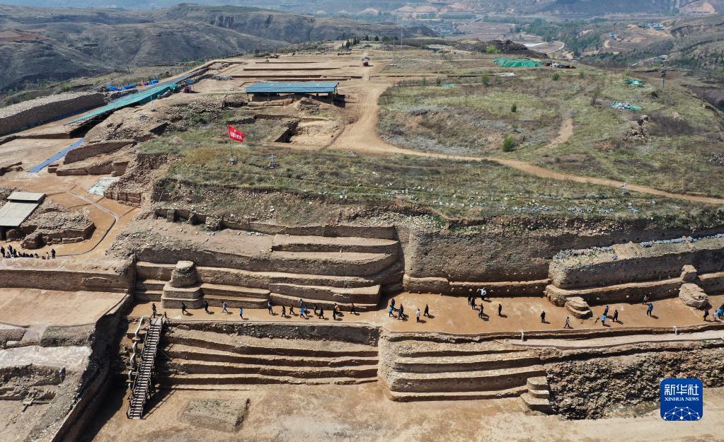 4月26日,外宾在陕西石峁遗址皇城台遗址参观调研(无人机照片)。
