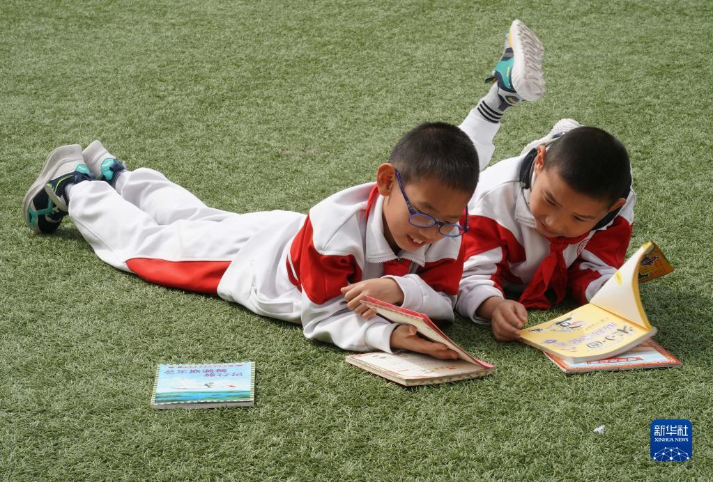 4月28日,在人大附中实验小学,学生在活动中阅读图书。