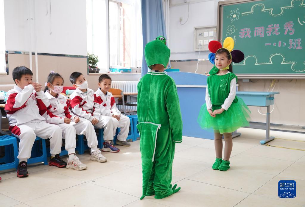4月28日,在人大附中实验小学,一年级(1)班的学生在活动中进行戏剧表演。