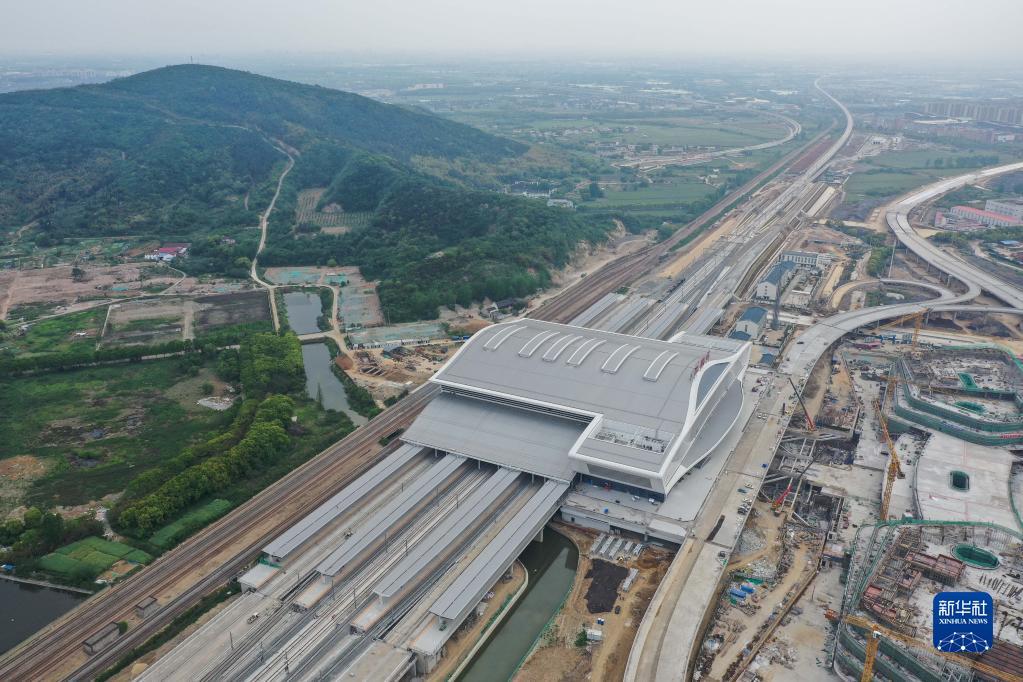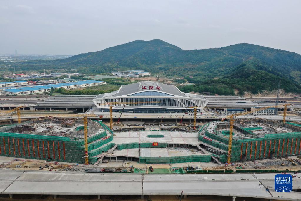 这是沪宁沿江高速铁路江阴站站房(4月28日摄,无人机照片)。