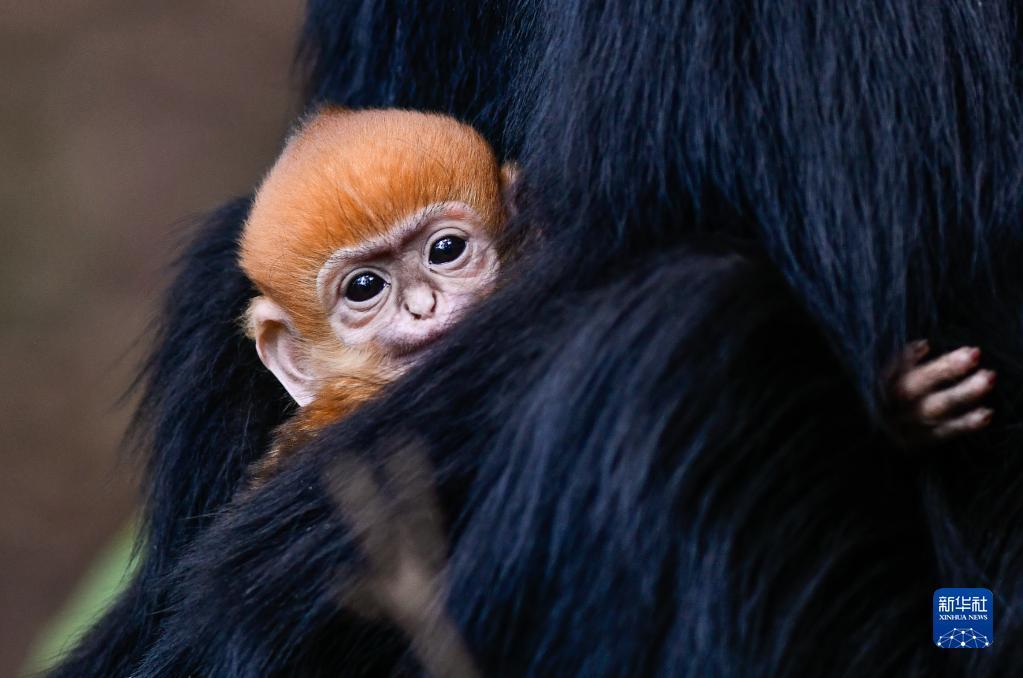 在贵州麻阳河国家级自然保护区拍摄的黑叶猴幼猴。新出生的黑叶猴毛色呈金黄色,几个月后逐渐变成黑色(4月30日摄)。