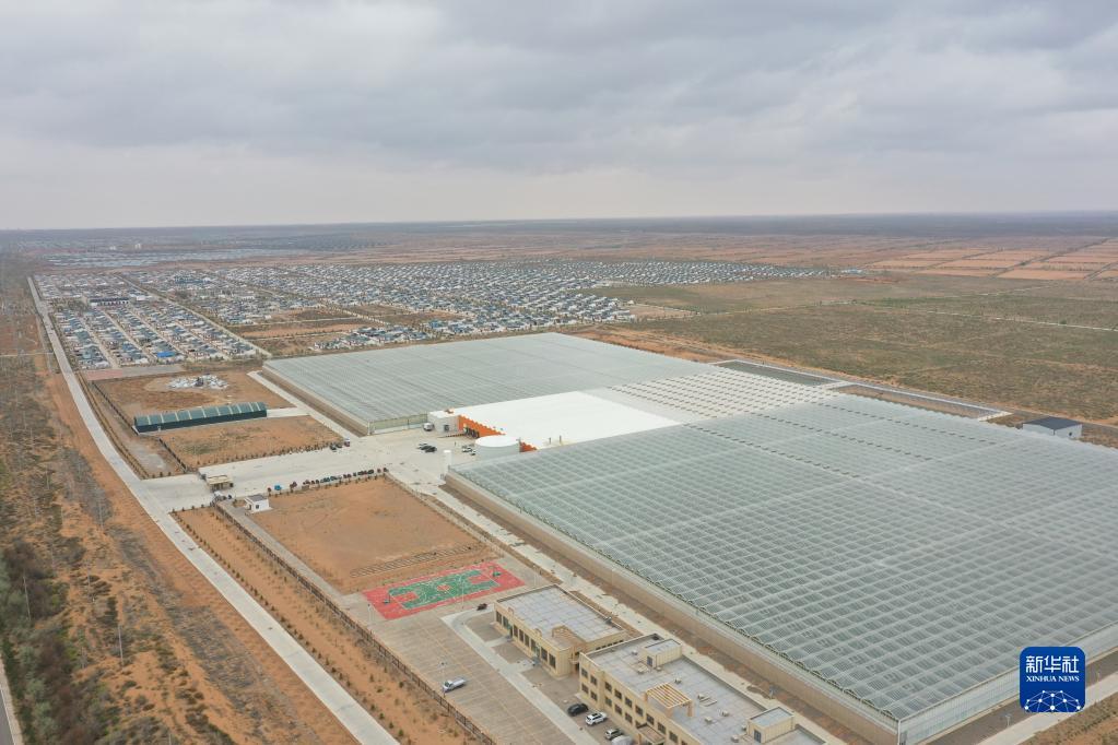 这是2023年5月7日拍摄的智能番茄种植大棚和移民新村(无人机照片)。