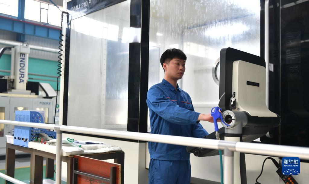 5月12日,在沈阳睿昇精密制造有限公司,一名已和企业签约的沈阳工学院机械工程与自动化学院毕业生在企业车间进行实训操作五轴加工中心。