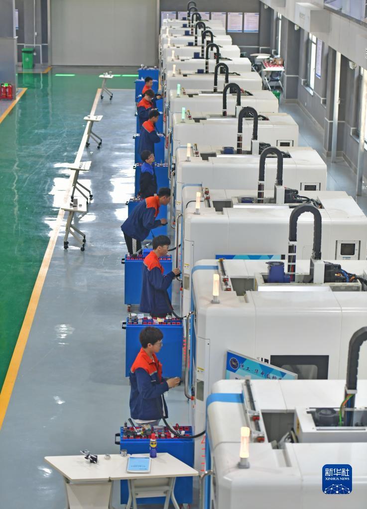 5月12日,沈阳工学院机械工程与自动化学院学生在学校实训车间操作五轴加工中心。