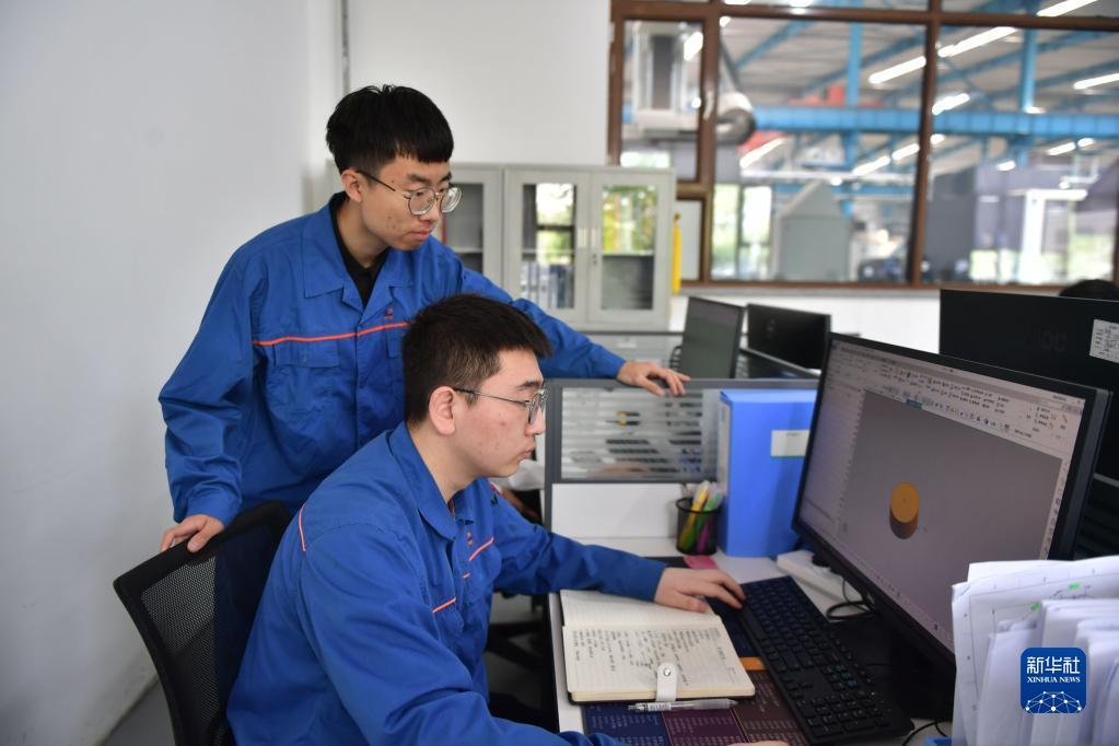 5月12日,在沈阳睿昇精密制造有限公司,一名已和企业签约的沈阳工学院机械工程与自动化学院毕业生(下)在企业车间办公室设计零部件。