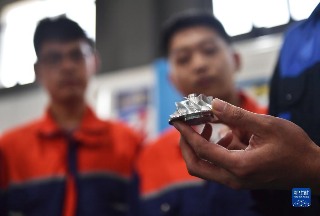 5月12日,在沈阳工学院实训车间,老师给机械工程与自动化学院学生讲解叶轮加工方法。