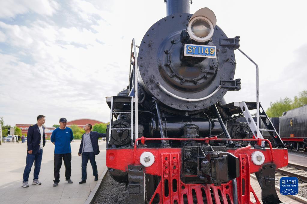 5月17日,游客在大安北蒸汽机车陈列馆游览。