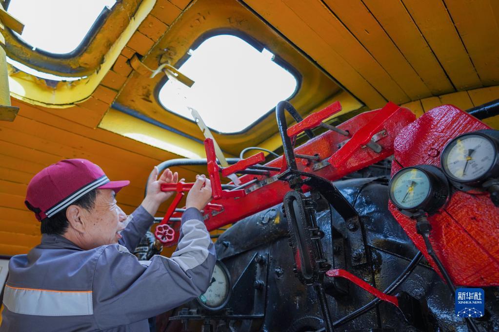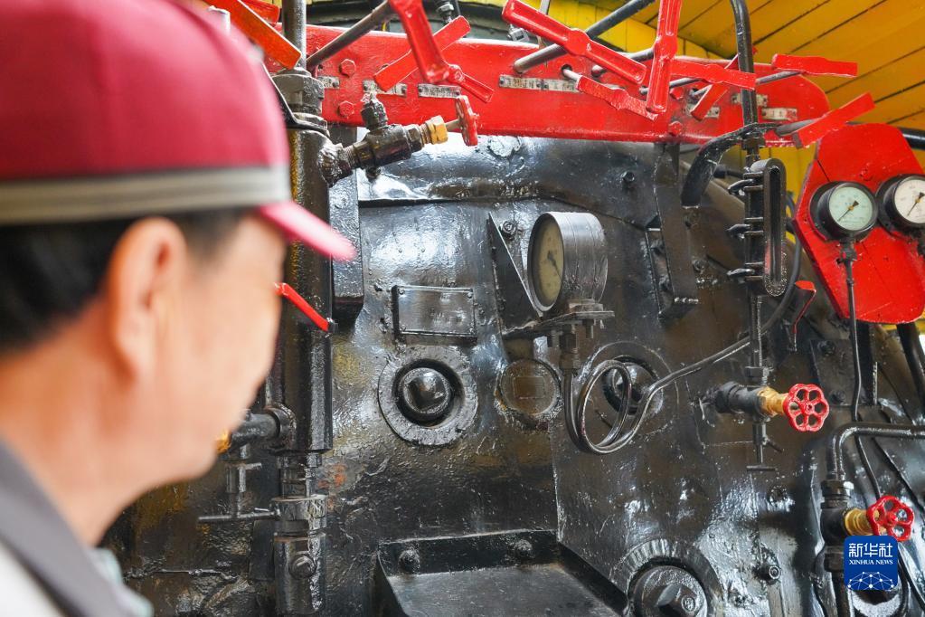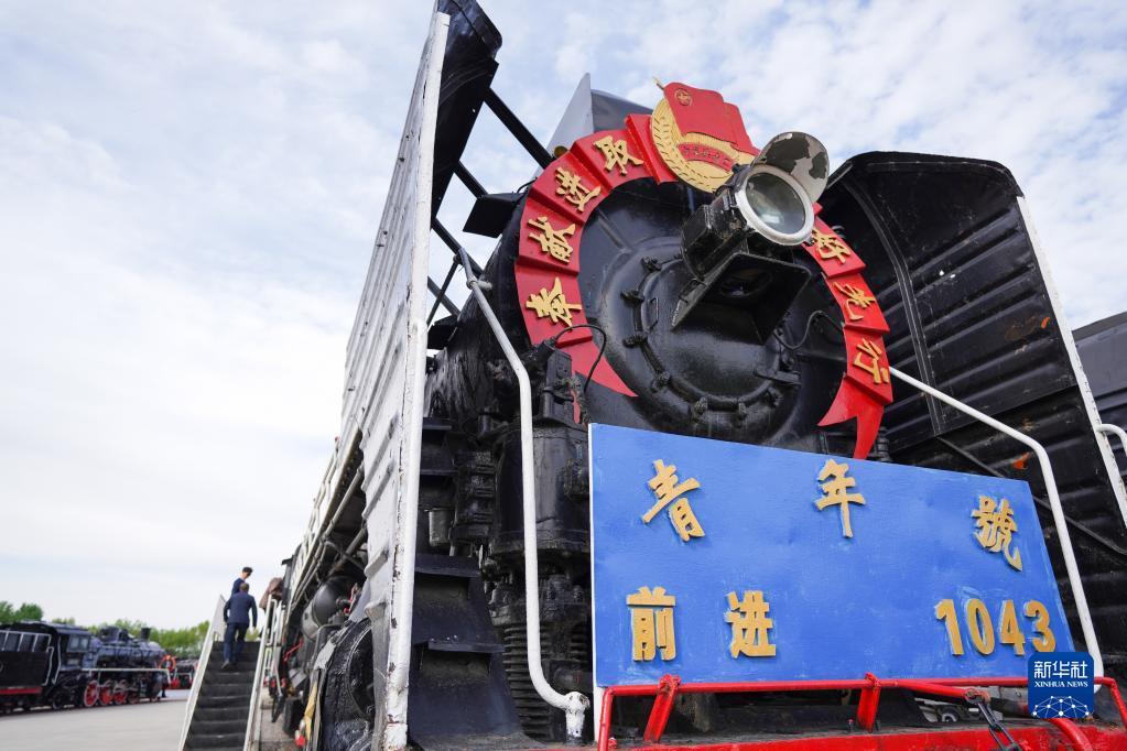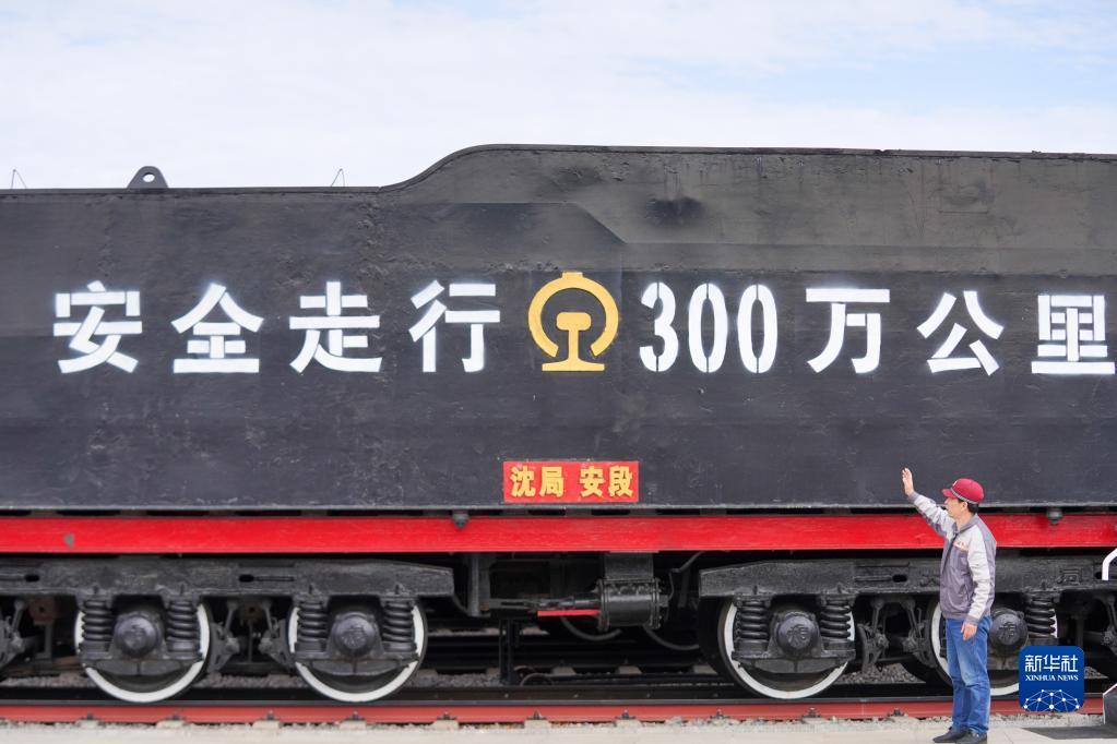 5月17日,中国铁路沈阳局集团有限公司白城机务段工作人员在大安北蒸汽机车陈列馆巡查。