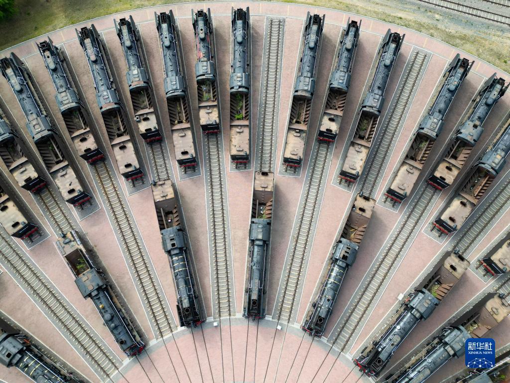 停放在大安北蒸汽机车陈列馆内的蒸汽机车(5月17日摄,无人机照片)。