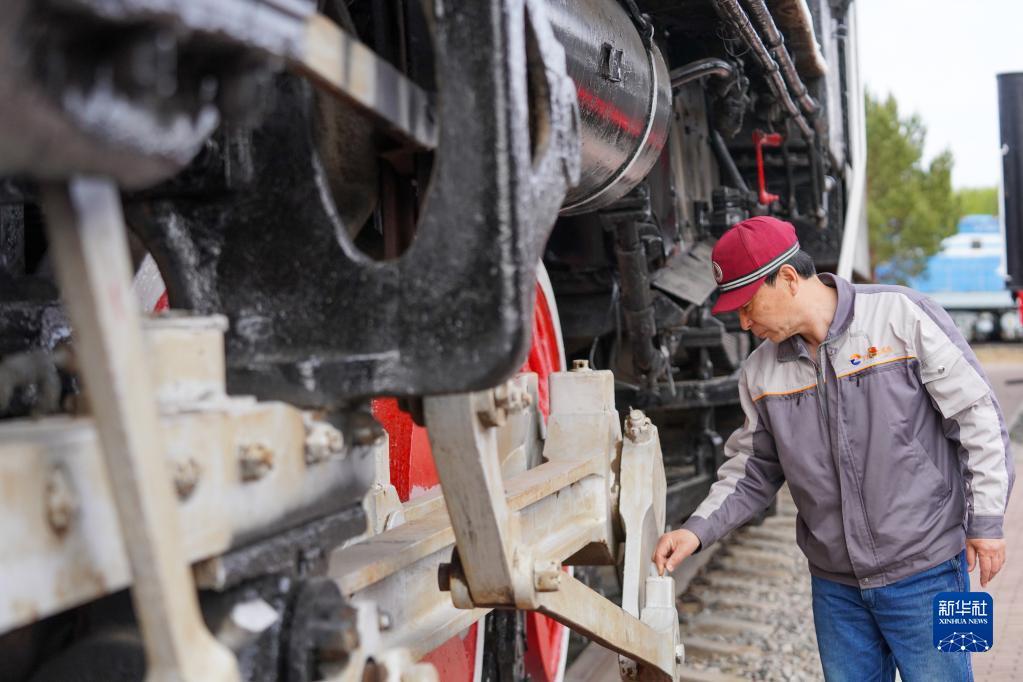 5月17日,工作人员在大安北蒸汽机车陈列馆维护蒸汽机车。