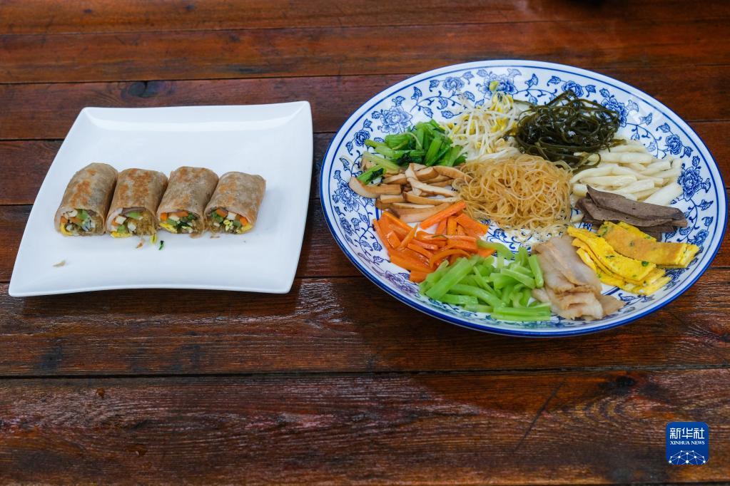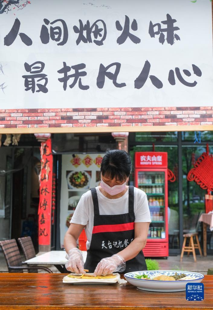 5月17日,在天台山游客中心,天台记忆餐厅的工作人员制作当地特色美食“饺饼筒”。