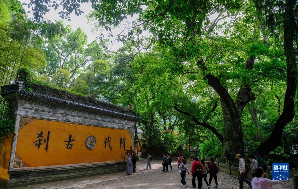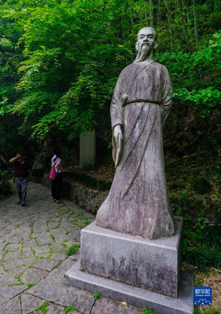 石梁飞瀑景区的徐霞客雕像(5月16日摄)。