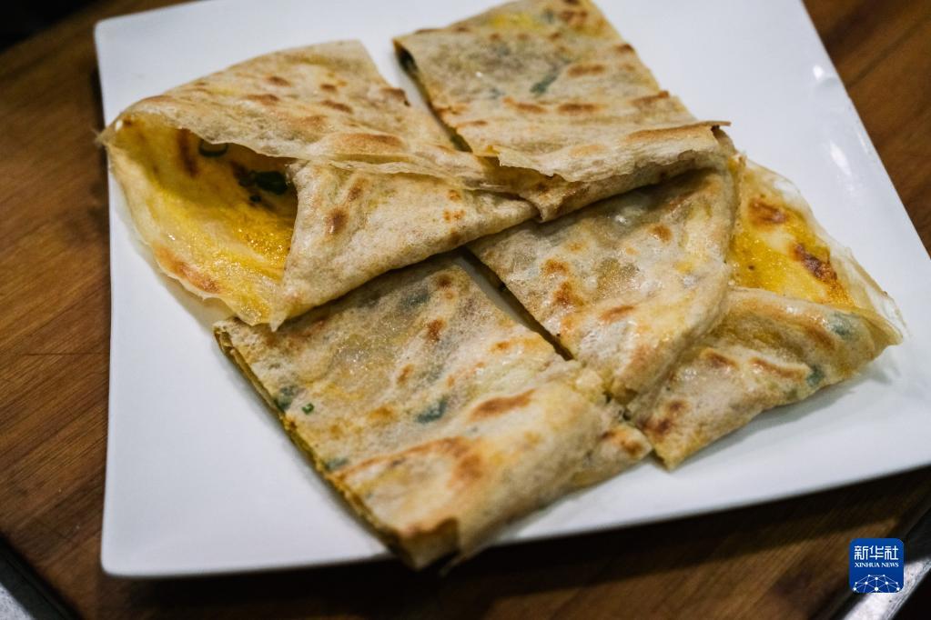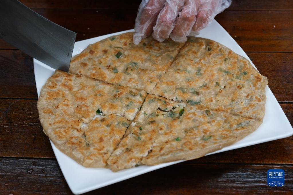 在天台山游客中心拍摄的当地特色美食“麦饼”(5月17日摄)。