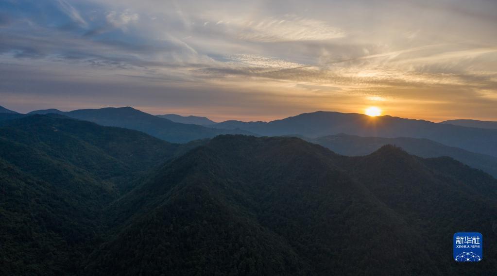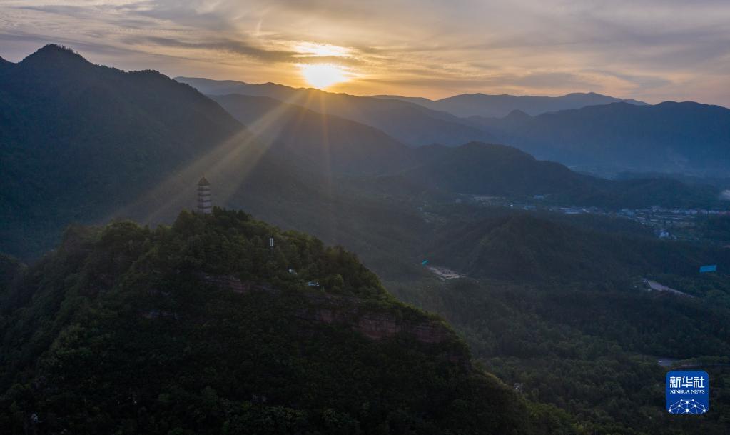 5月16日,在浙江天台县,清晨的阳光照在赤城山顶的梁妃塔上(无人机照片)。
