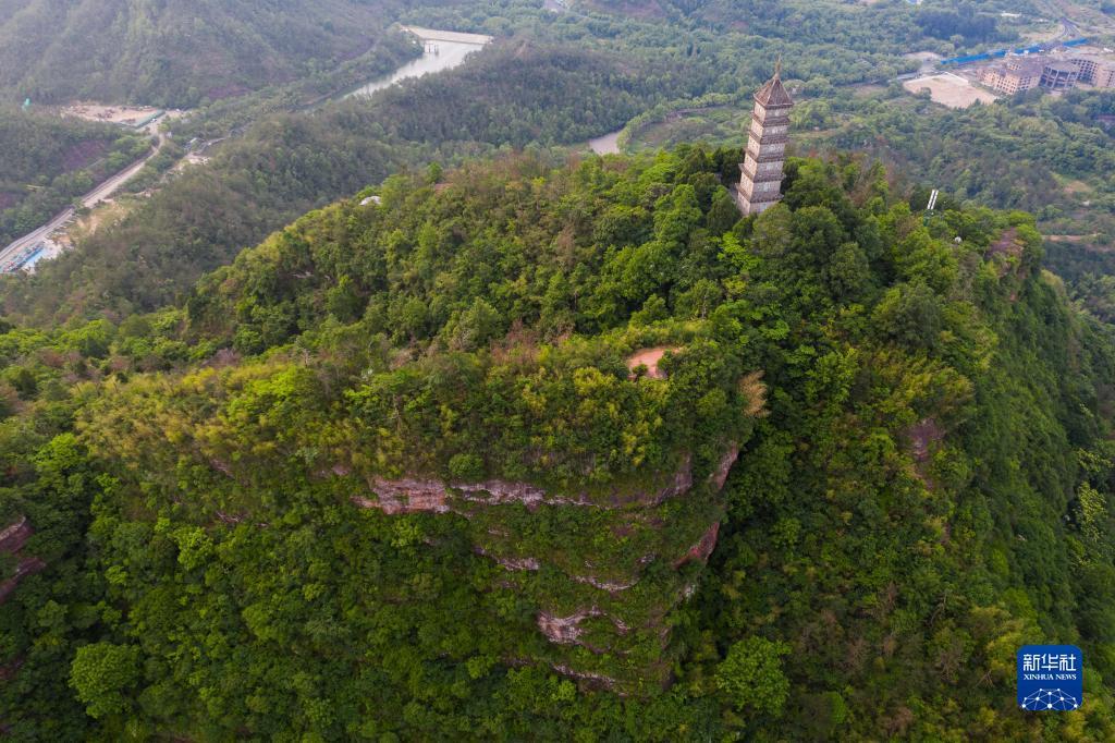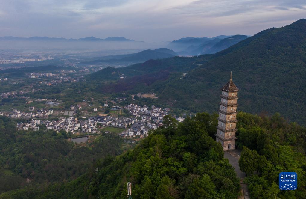 俯瞰天台县的赤城山及山顶的梁妃塔(5月16日摄,无人机照片)。