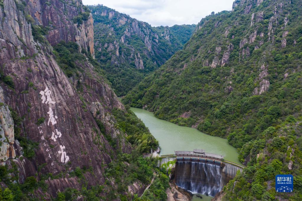 天台山琼台仙谷景区(5月16日摄,无人机照片)。徐霞客在游记中写道:“峰头中断,即为双阙;双阙所夹而环者,即为琼台。”