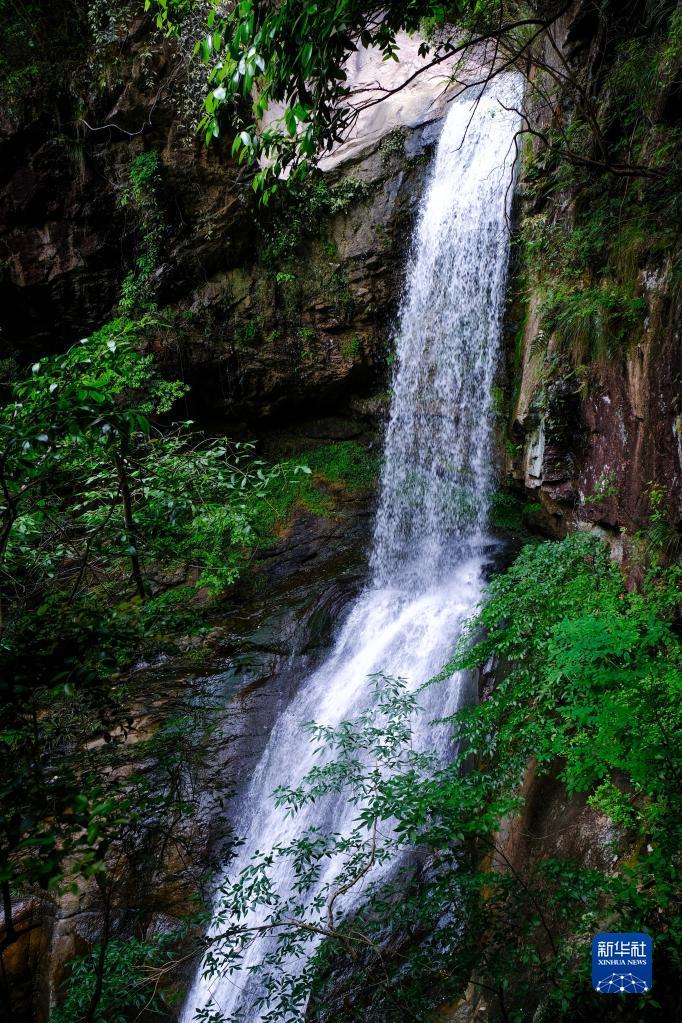 石梁飞瀑一景(5月16日摄)。石梁飞瀑景点有一条巨大石梁横跨在两崖之间,瀑布水流从梁底穿过,坠入幽谷之中。徐霞客在游记中写道:“下瞰深潭,毛骨俱悚。”