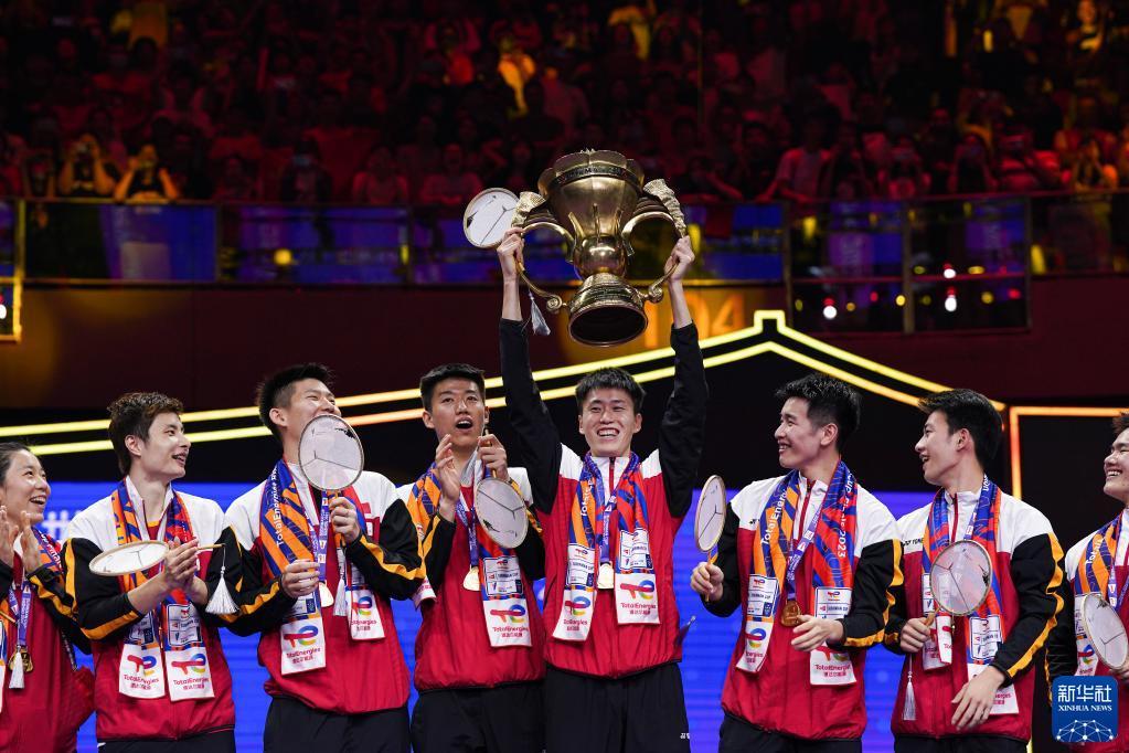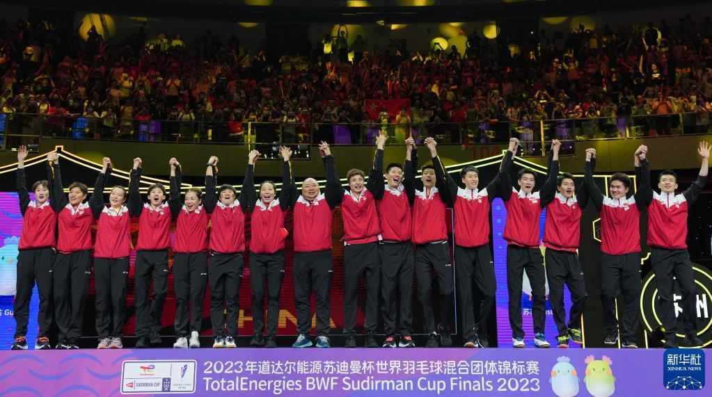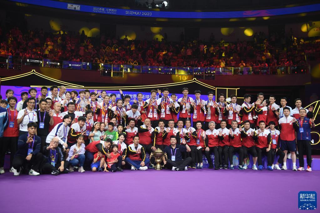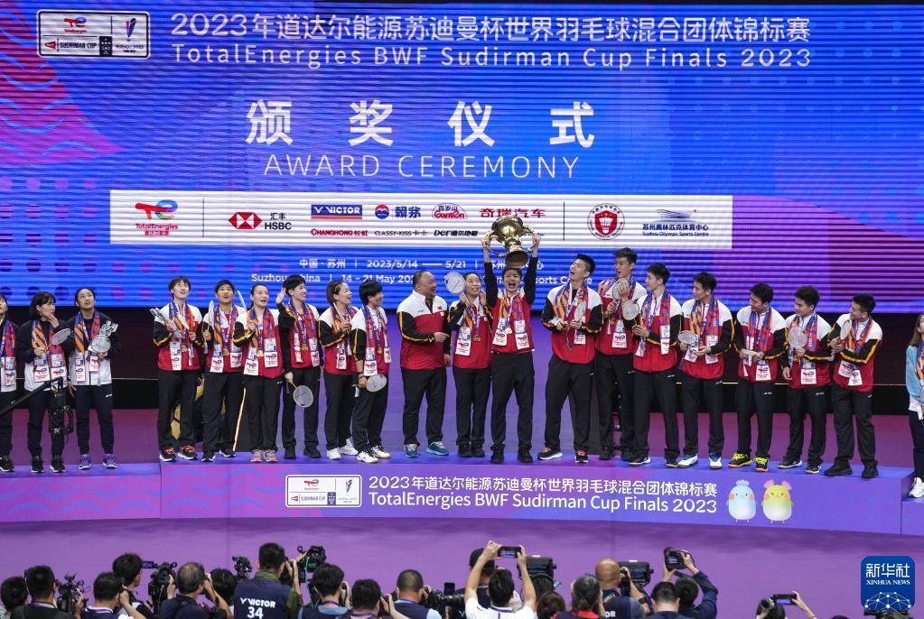 当日,2023年苏迪曼杯世界羽毛球混合团体锦标赛颁奖仪式在江苏省苏州市举行。中国队在决赛中以3比0战胜韩国队,夺得冠军。