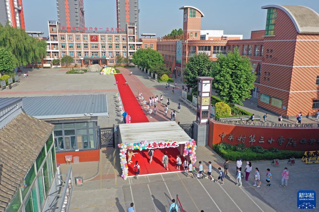 中关村第三小学雄安校区的学生走入校园(6月1日摄,无人机照片)