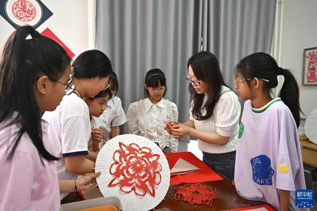 5月31日,中关村第三小学雄安校区美术老师高娜(右二)指导剪纸社团的学生们进行剪纸创作。