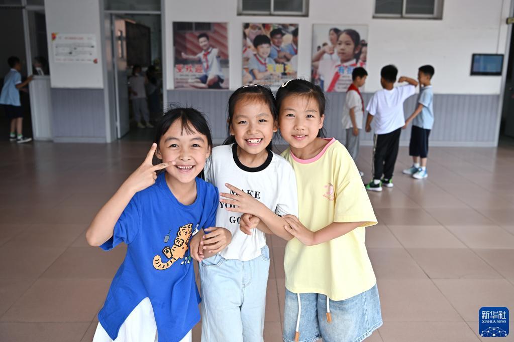 5月31日,中关村第三小学雄安校区的学生课间休息时在教学楼前活动。