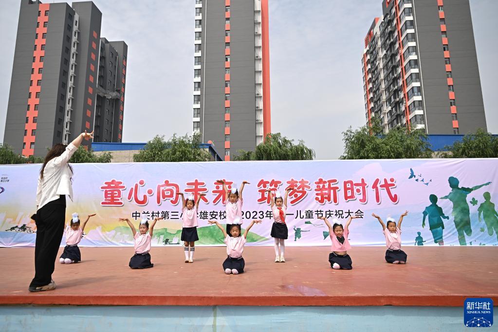 5月31日,中关村第三小学雄安校区舞蹈社团的学生在老师的指导下为六一儿童节庆祝大会排练节目。