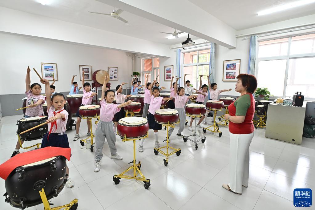5月31日,中关村第三小学雄安校区的音乐老师高向红(右)指导中国鼓社团的学生排练。