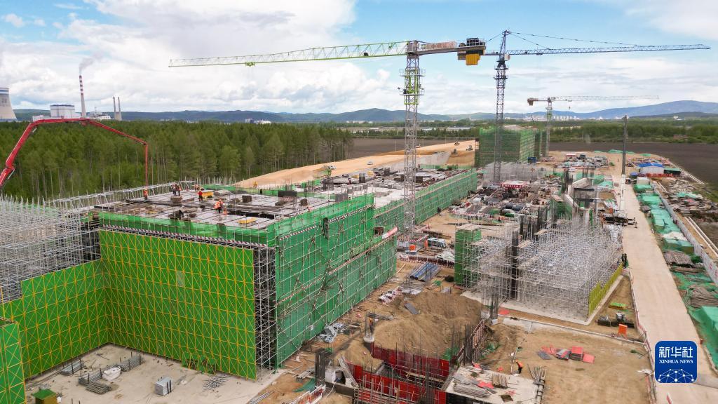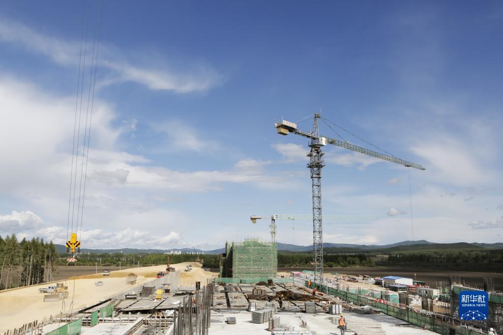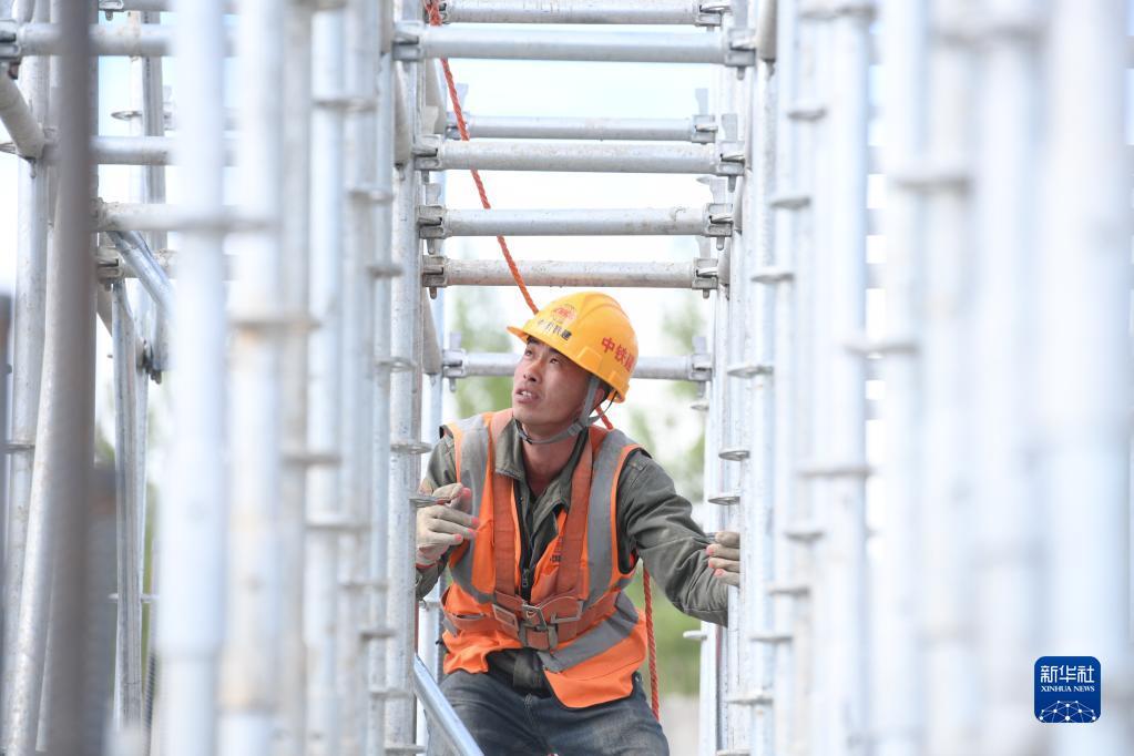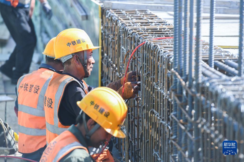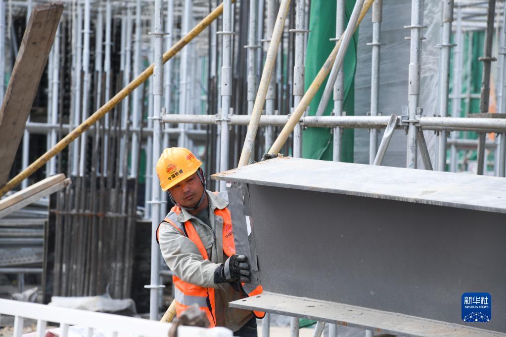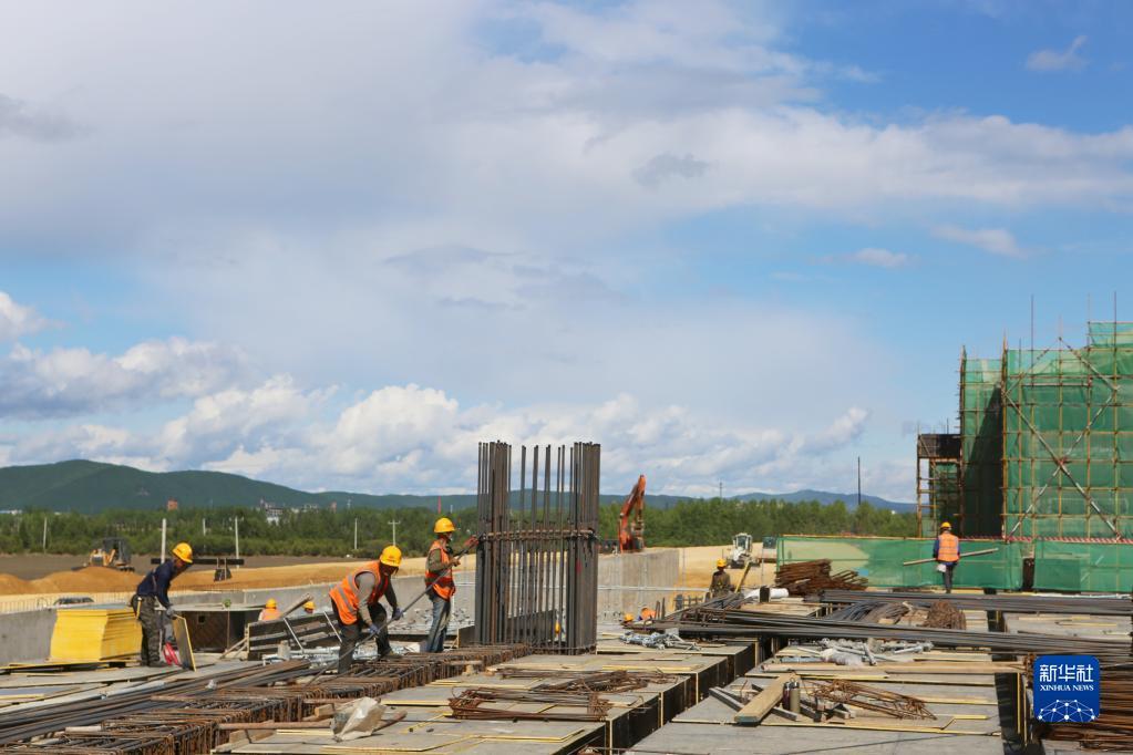 在伊春西站主体结构施工现场,工人在建设作业(6月2日摄)。