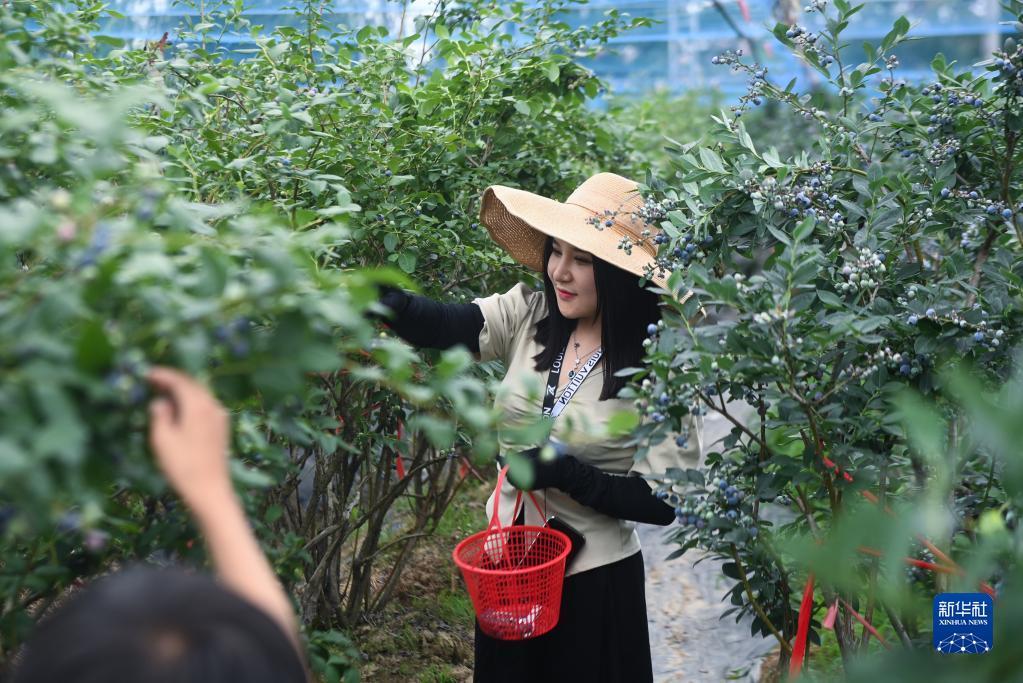 6月3日,在位于长兴县虹星桥镇谭家村的金蓝家庭农场的蓝莓种植区内,游客采摘成熟的蓝莓。