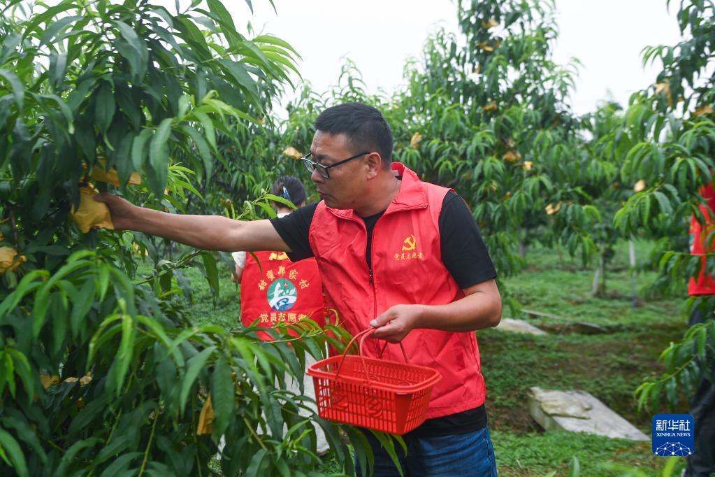 6月3日,在位于长兴县虹星桥镇郑家村的金唐湾生态农业基地内,党员志愿者帮助采摘成熟的黄桃。